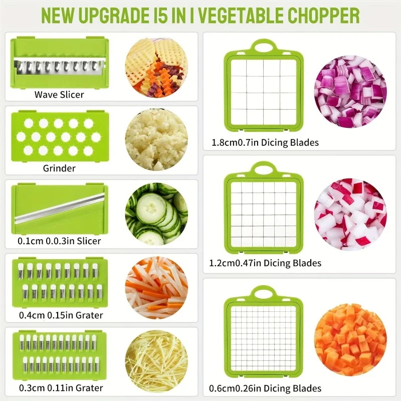 Cortador de verduras 22 en 1 con contenedor, picadores y cubitos, cortador de alimentos para cebolla, tomate, herramienta de cocina múltiple con exprimidor de limón, 13 cuchillas